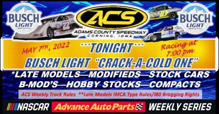 After three consecutive rain outs the Adams County Speedway will get the 2022 season underway with the 1st Annual Busch Light Crack A Cold One on May 7th. Saturday nights action will include a special $1,000 to win Late Model Feature for IMCA Type Late Models/I-80 Bragging Rights rules. In addition all classes will be racing for additional purse to get the season started, Including the Poet Modifieds, O'Reilly Auto B-Mods, Northland Oil Stock Cars, Chat Mobility Hobby Stocks, and Liberty Realty Compacts!