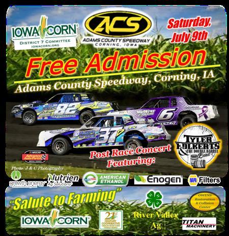 FREE-FREE-FREE.... That's right, join us this Saturday night July 9th, as ACS in partnership with Iowa Corn District 7, Presents "Salute to Farming Night", with absolutely FREE Grandstand Admission. Enjoy all the action of the Liberty Realty Compacts, Chat Mobility Hobby Stocks, O'Reilly Auto B-Mods, Northland Oil Stock Cars, & Poet Biorefining Modifieds.